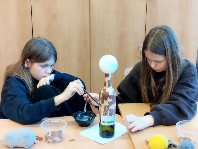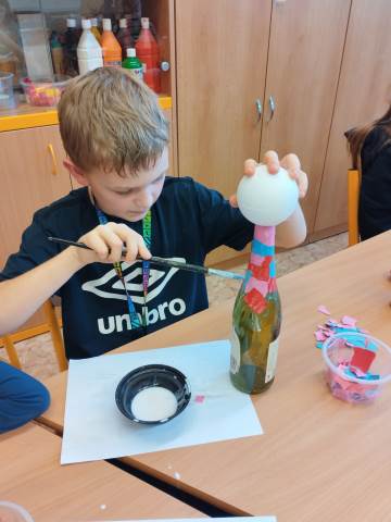 Naše povídání jsme doplnili výtvarnou a pracovní činností. Děti vytvořily krásné mandaly na téma „Můj mazlíček“, kde pomocí barev a různých tvarů znázornily své zvířecí kamarády. Velký úspěch měla také kočička z láhve, kterou si děti s chutí vyráběly a zdobily podle vlastní fantazie.