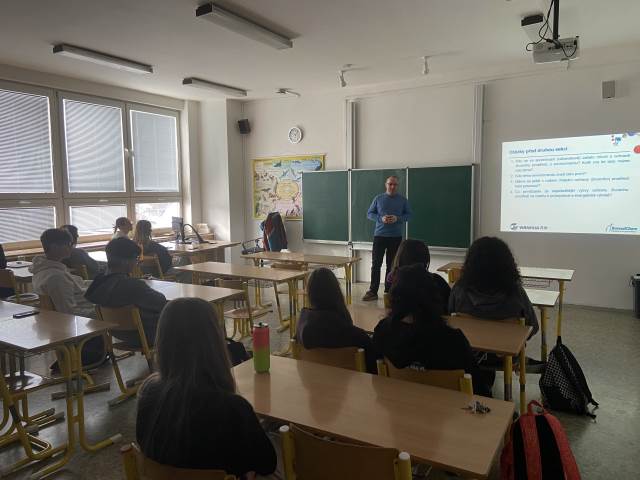 V pondělí 23. února proběhla na naší škole v rámci výuky chemie odborná přednáška z cyklu Den pro školu, která byla určena žákům prvního ročníku. Jako odborník z praxe se nám tentokrát představil pan Ing. Aleš Hanslík ze společnosti BorsodChem, který vystoupil s přednáškou Zelený pohled na svět. Hlavním tématem byl vodík jako alternativní palivo a jeho možné využití v dopravě, energetice i průmyslu. Přednášející posluchačům srozumitelně vysvětlil základní principy fungování vodíkových technologií, jejich výhody i limity a zasadil je do širšího kontextu současných environmentálních výzev. Nechyběla ani zmínka o tom, jakou roli může vodík sehrát při snižování emisí skleníkových plynů a přechodu k udržitelnějším zdrojům energie. Přednáška kladla důraz zejména na propojení teorie s praktickými příklady z reálného života. Celá akce byla součástí vzdělávacího programu Odborníci do škol Nadace České spořitelny, jehož cílem je přiblížit žákům aktuální vědecká a technická témata prostřednictvím lidí přímo z oboru. Dnešní poutavé vyprávění tak bylo nejen obohacením výuky, ale i inspirací k dalšímu zájmu studentů o přírodní vědy, techniku a otázky udržitelné budoucnosti.