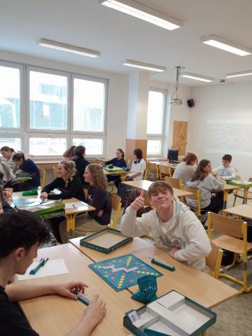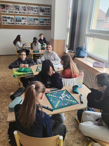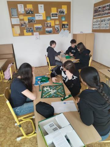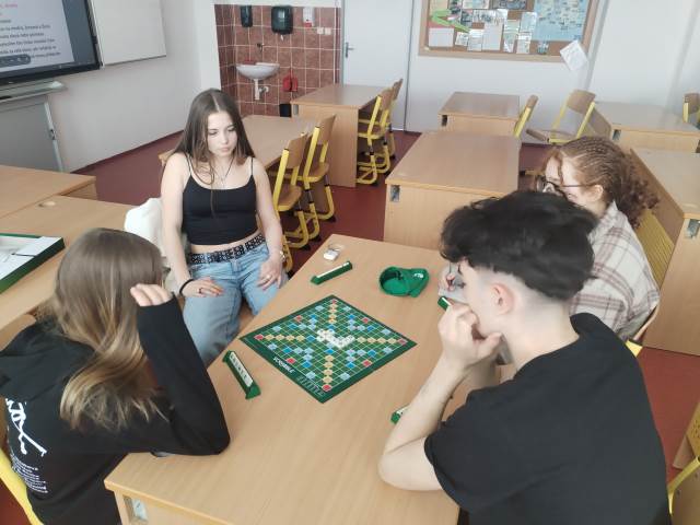 V minulých týdnech se v hodinách angličtiny ve třídách na nižším gymnáziu odehrál nelítostný boj v anglické verzi hry Scrabble. Účelem hry je složit anglické slovíčko z předem náhodně vybraných písmen a vhodně napojit na předchozí slova soupeřů. Každé písmenko má svou bodovou hodnotu, která se sčítá v rámci celého slova. Děti se hře plně oddaly a byly schopné vymyslet spoustu variant. Dva nejlepší hráči z každé třídy postoupili do finále. Zde se utkali dva nejlepší hráči primy proti dvěma hráčům ze sekundy a nejúspěšnější hráči z tercie se utkali proti hráčům z kvarty. Z kategorie prima a sekunda se na prvním místě umístila Beáta Bartoníčková z 2. G, druhé místo obsadil Martin Broža z 1. G a třetí místo patřilo Maxi Javůrkovi z 2. G. První místo v kategorii tercie a kvarta obsadila Viktorie Doleželová ze 4. G, druhé místo získal Nikolas Horák z 3. G a třetí místo patřilo Emě Holáňové ze 4. G. Všem hráčům děkujeme za skvělé výkony!