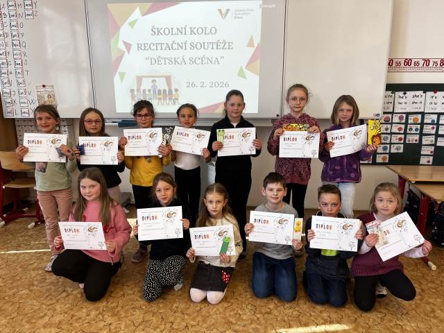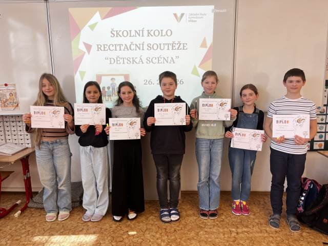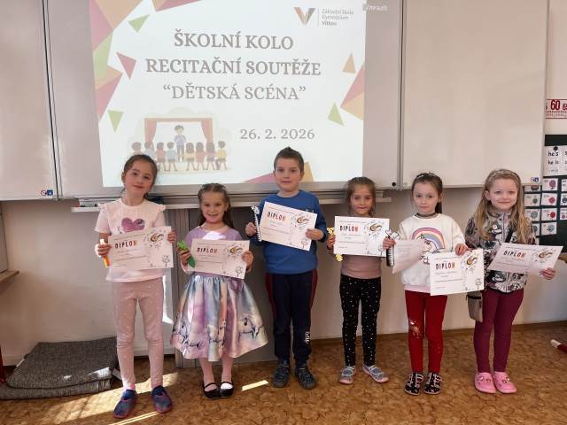Školní kolo recitační soutěže pro žáky 1. stupně proběhlo 26. února 2026. Soutěž byla rozdělena do tří věkových kategorií a porota z každé kategorie vybrala dva soutěžící, kteří reprezentovali školu v okrskovém kole. Všichni recitátoři se snažili svým přednesem vystihnout pocity, myšlenky nebo náladu autora. Do okrskového kola postoupila děvčata Beáta Gebauerová z 1. C, Natálie Vicherková a Alice Pavlíková z 2. B, Terezie Hellebrandová a Iveta Kudelová ze 4. C třídy. Okrskové kolo recitační soutěže se uskutečnilo 3. března 2026 ve Středisku volného času ve Vítkově. K děvčatům z 1. stupně se přidaly vítězky školního kola 2. stupně a příslušných ročníků víceletého gymnázia Aneta Petrželková z 1. G, Emma Vašková z 6. B, Anděla Jakubíková z 3. G a Simona Vránová ze 4. G třídy. Děvčata předvedla skvělé interpretační schopnosti a svými výkony si postup do okresního kola zajistily Natálie Vicherková, Terezie Hellebrandová, Aneta Petrželková a Anděla Jakubíková. Všem recitátorům děkujeme za krásný kulturní zážitek a postupujícím budeme držet palce v okresní kole, které se bude konat 13. března v Loutkovém divadle SVČ Opava.