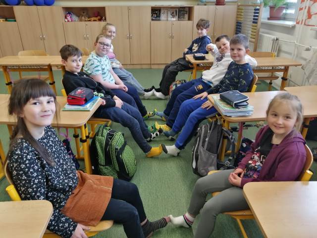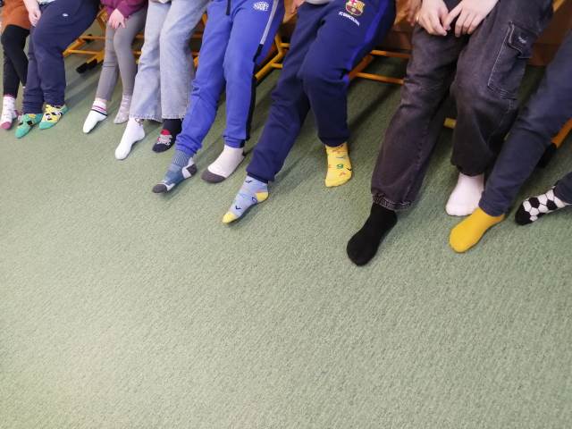Na naší škole se v pátek 19. března konal veselý a zároveň smysluplný „Ponožkový den“. Tento den byl věnován podpoře tolerance, respektu a přijetí odlišnosti mezi lidmi. Žáci i učitelé přišli do školy v různých, barevných a často i nesourodých ponožkách, které symbolizovaly jedinečnost každého z nás. Už od rána panovala ve škole dobrá nálada. Chodby byly plné smíchu a zajímavých kombinací ponožek – od pruhovaných přes puntíkované až po ponožky s pohádkovými motivy.